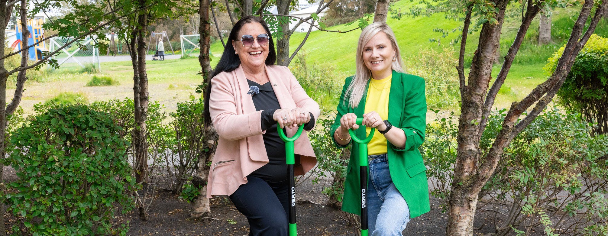 Inga Sæland, félags- og húsnæðismálaráðherra, og Halla Thoroddsen, forstjóri Sóltúns, tóku í dag fyrstu skóflustunguna að stækkun hjúkrunarheimilisins Sóltúns í Reykjavík.