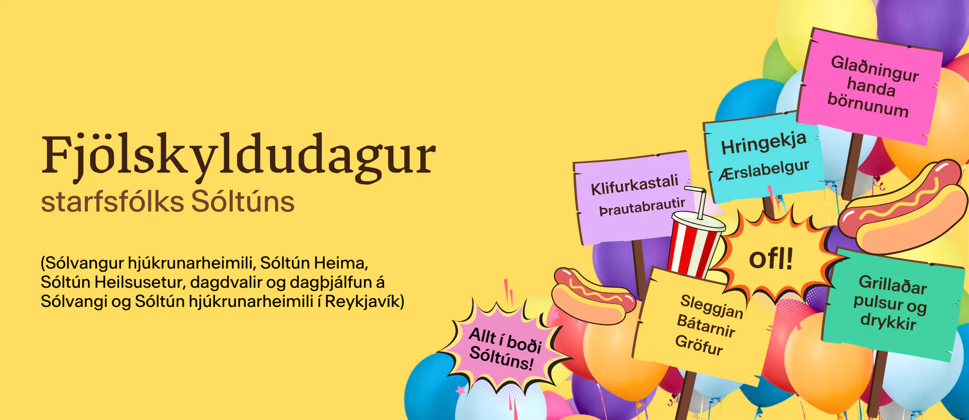 Fjölskyldudagur starfsfólks Sóltúns, þ.e. Sólvangur hjúkrunarheimili, Sóltún Heima, Sóltún Heilsusetur, dagdvalir og daþjálfun á Sólvangi og Sóltún hjúkrunarheimili, verður haldinn miðvikudaginn 11.september. Hátíðarhöldin fara fram á Víkingavöllum Fjölskyldugarðsins í Laugardal kl. 17-19. Boðið verður upp á grillaðar pulsur og drykki, frítt í öll tæki og glaðningur handa börnunum! Skráning á Workplace!